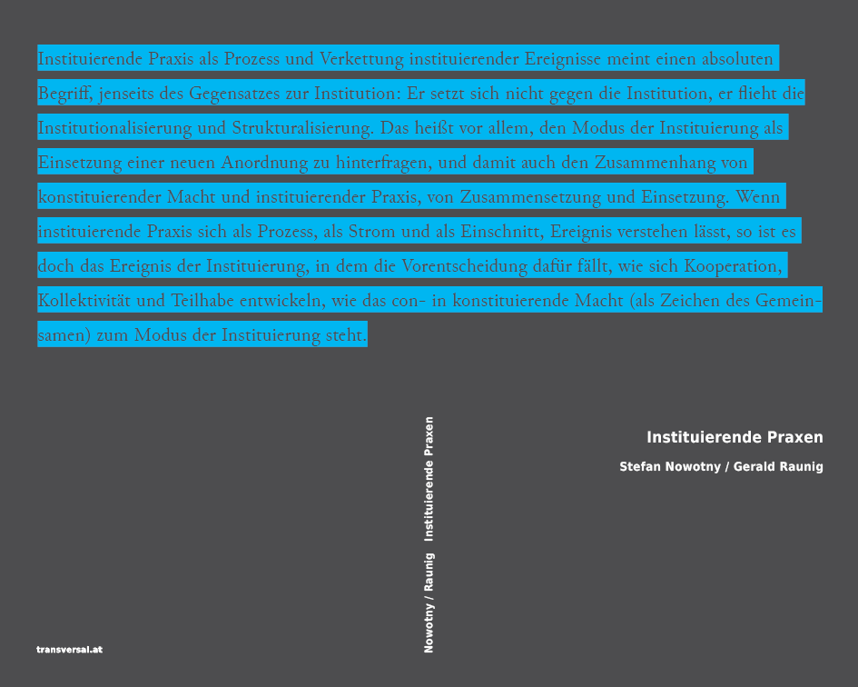 Was heißt Institutionskritik? Diese Frage lässt sich heute nicht mehr unüberprüft entlang der klassischen Gesten der Negation und Verwerfung des Institutionellen einerseits sowie der Wiedereingliederung von Kritik in institutionelle Apparaturen andererseits stellen. Sie ist zur Frage nach einer Kritik geworden, die sich nicht mehr primär über die Distanznahme des Urteilens vollzieht, sondern über eine Praxis, die sich ins Kritisierte immer schon involviert weiß. Und zugleich ist sie zur Frage nach einer Affirmation geworden, die nicht mehr Komplizenschaft mit dem Bestehenden bedeutet, sondern die Aktualisierung von sozialen Potenzen, die ein differenzielles Wissen über institutionelle Zusammenhänge entfalten. In der Neuauflage ihres Buchs verdichten Stefan Nowotny und Gerald Raunig den Begriff der instituierenden Praxis, der weit über die kanonisierten Formen von Institutionskritik hinaus reicht, indem er diese selbst aktualisiert und zugleich in eine breitere historisch-politische Perspektive stellt.