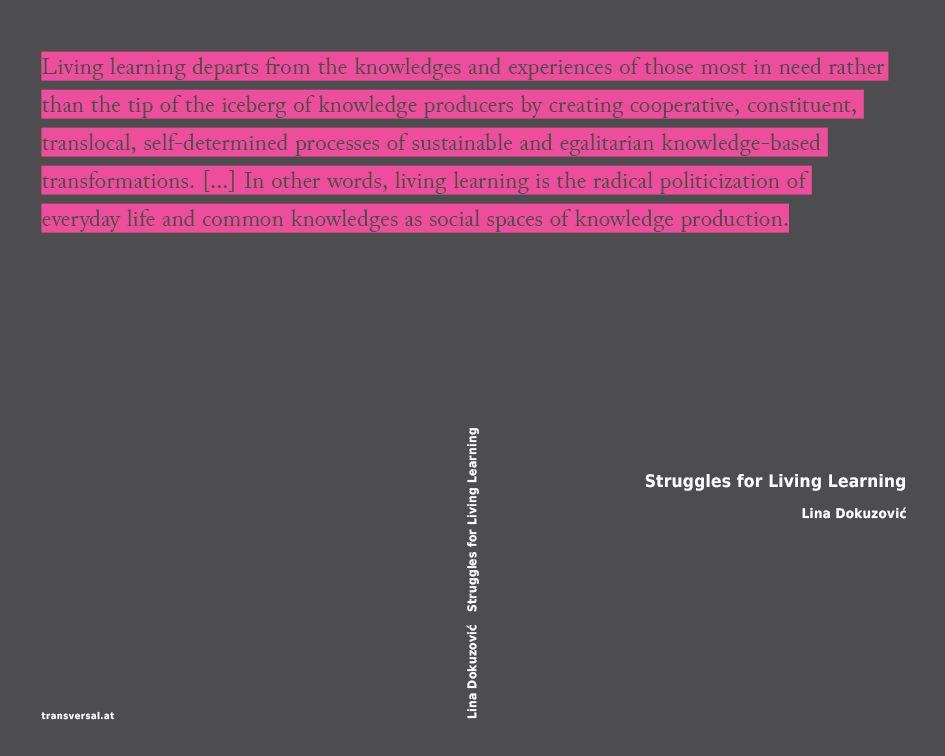 Numerous knowledge-based struggles emerged between 2008–2011 which questioned the changes taking place in universities, on the one hand, and the potentiality of the university as a space for translocally contesting those global transformations, on the other. Through the expansion of those struggles, their contention shifted to how self-education and struggle beyond the university could intervene or create counter-perspectives for change. This book presents the demands, practices, and perspectives developed within those struggles against the backdrop of commodifying transformations in the field of knowledge production – (primarily higher) education, research, and lifelong learning. These examples ultimately debunk major global knowledge-based policy perspectives, primarily those driven by the EU, and their objectives of crisis resolution and sustainable development. As an alternative, this book follows and further develops grassroots practices and perspectives of “living learning” from knowledge-based struggles, presenting socially just and equitable challenges to the transformations in the field of knowledge.