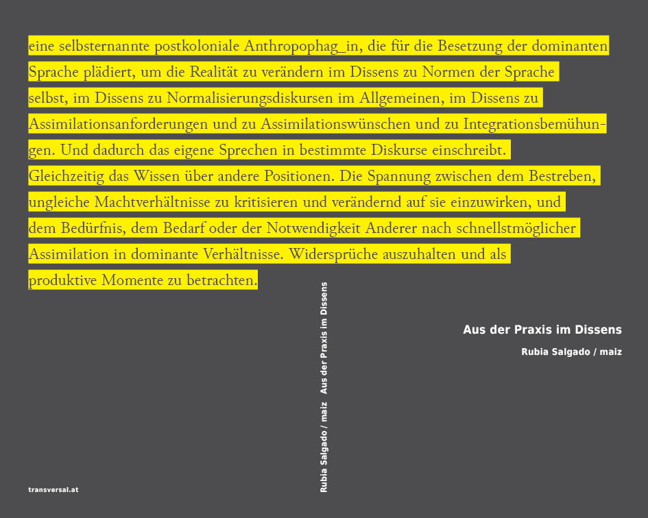 Der Kampf um Anerkennung, das Wissen um Unterwerfung, die Umarbeitung der Anrufungen, die Fragen nach widerständiger Handlungsfähigkeit, das Annehmen einer strategischen Identität als Ausgangsbasis der politischen Artikulation und das Abtasten der Grenzen eines (selbst)proklamierten strategischen Essenzialismus, das Ringen um Protagonismus und seine möglichen Definitionen und Austragungen, das Zelebrieren einer anthropophagischen Haltung und das Hinterfragen dieses Konzeptes, der Horizont der gegenhegemonialen Wissensproduktion und der Kulturarbeit abseits multikulturalistischer Konzepte und Praxen, das Sich-Widersprechen, das transformative Aneignen der hegemonialen Sprache, das Betrachten von Sprache als realitätskonstituierend, das Befragen des Lehrens der hegemonialen Sprache als Zurichtung. Die Bemühung um ein Sprechen und ein Handeln im Widerstand und im Dissens zur herrschenden Selbstverständlichkeit der Diskriminierungen. Ein Schreiben im Kollektiv verortet, eingebettet, eingerahmt. Fragen, Nachdenken und eroberte Perspektiven aus dem Denken und Handeln in einer Selbstorganisation.