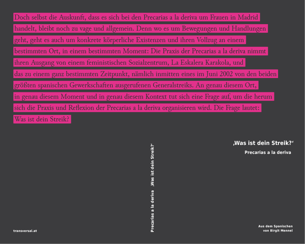 „Precarias a la deriva“ steht für einen heterogenen Zusammenhang von Frauen, die sich 2002 während des Generalstreiks in Spanien zusammengefunden haben, um die Möglichkeit des Handelns bzw. des Streiks in Zeiten der Prekarität zu erproben. Im Vordergrund ihres Interesses steht dabei nicht die Produktion eines distanten Wissens über „Betroffene“, sondern vielmehr die Hervorbringung einer auf Sorgebeziehungen basierenden Sozialität. Die in der Neuauflage des Bands versammelten Texte sind kollektiv verfasst und begeben sich auf die Reflexionsebene einer Praxis, die auf eine Unterbrechung der sozialen Fragmentierung und Isolation abzielt und zu politischem Handeln ermächtigt.