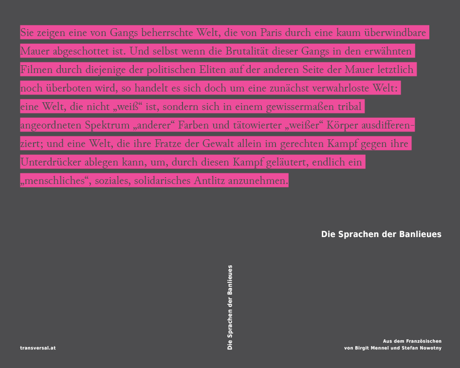 In den französischen Banlieues verdichten sich heute unterschiedlichste Erfahrungen der Migration, häufig vor dem Hintergrund geschichtlicher Kolonialverhältnisse, ihrer Hinterlassenschaften und Fortschreibungen. Allzu oft aber verfährt sich der Blick auf die Artikulationen dieser Erfahrungen – die Sprachen der Banlieues – in unterschiedlichen Phantasmen des Mangels oder aber eines sich selbst undurchsichtig bleibenden Überschusses: Wo man einerseits die erhabene Sprache der Nation verkümmern sieht, wird andererseits auf eine gleichsam babylonische Sprachenvielfalt verwiesen, die aber eben auch bloße Sprachverwirrung sein könnte; und wo die einen, angesichts brennender Autos beispielsweise, nur stumme Gewalt erblicken, erklingt den anderen der Hahnenschrei künftiger Revolutionen. Was aber, wenn das Scheitern oder Ausbleiben von Übersetzung und Artikulation, das all diese Figuren in der einen oder anderen Weise unterstellen, zuallererst die soziale und politische Sprache jener kennzeichnete, die die Banlieues in ihre eigenen Projektionen zu bannen versuchen (und damit erneut zu „Orten des Banns“ machen)?