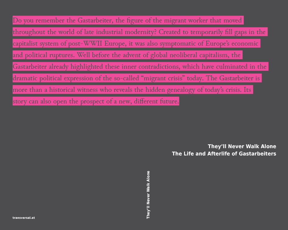 The Gastarbeiter, the figure of the migrant worker that circulated throughout the world of late industrial modernity, was created in order to temporarily bridge gaps in the economic system of Western European Capitalism. At the same time, however, it was also a symptom of its early economic and political ruptures. Emerging from the problematic interstices and inequalities of the “developed” North and chronically “underdeveloped” South, between “center” and “periphery,” and originally occupying a legally regulated space (and time) of European constitutional democracies, the Gastarbeiter can be seen today as a sort of avant-garde figure that stood at the crossroads of the ideologically hybrid and shifting frontiers between capitalism and socialism. This early messenger of global transformation highlights not only the collapse of socialism and the development of a global neoliberal capitalism. It also points to the inner contradictions of the latter that have developed into a full-fledged crisis in recent years, which have, not by chance, found their dramatic political expression in the current so-called "crisis" of refugees and migrants. The old figure of the Gastarbeiter, therefore, seems to be at the very core of a hidden genealogy of today’s so-called "crisis" – making it necessary to disclose this genealogy across old and new ideological divides and political interests, and to thus reconnect our present with the past in order to not only understand the current "crisis," but to open the prospect of a new, changed future.