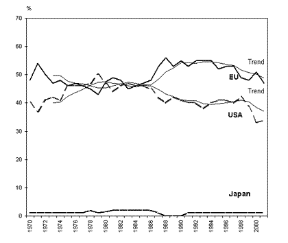Eine markante Gegenposition zur Globalisierungstheorie stellt die These der "trilateralen Regionalisierung" dar. Sie kann sich auf den Befund stützen, dass die "kapitalistische Triade" von USA, EU und Japan lediglich 15% der Weltbevölkerung umfasst, in den 90er Jahren aber zwischen zwei Dritteln und drei Vierteln der weltweiten ökonomischen Aktivitäten auf sich konzentrieren konnte.[40] Grafik 2 verdeutlicht, in welch hohem Maße sich das Zentrum des Kunstfeldes aus zwei der drei dieser ökonomisch mächtigen Triaderegionen rekrutiert, und zwar den USA und der EU.[41] Summiert man über alle Triaderegionen, ergeben sich Anteile in einer Spannweite von 95% bis 82% für den betrachteten Zeitraum. Diese Zahlen übertreffen die Anteile der Triade an den weltweiten ökonomischen Aktivitäten noch deutlich. Analog zur ökonomischen Globalisierung (außerhalb der Finanzmärkte) ließe sich auf dieser Grundlage somit vom Mythos der Globalisierung des Kunstfeldes sprechen.