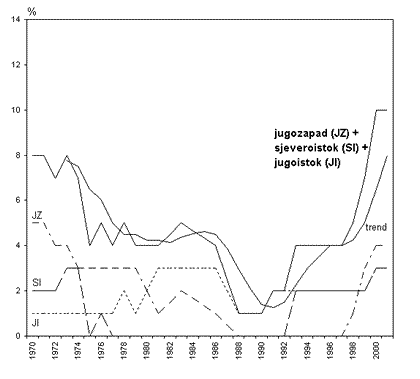 Grafika 1: Tri ugla svijeta. Vidljivost njegove umjetnosti 1970-2001. (Udio na top listi 100 umjetnica/umjetnika u %, sekundarna analiza umjetnicki kompas Capital)