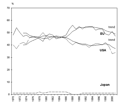 Markantnu kontrapoziciju teoriji globalizacije predstavlja teza o „trilateralnoj regionalizaciji“. Ona se moze osloniti na nalaz da „kapitalisticka trijada“ Sjedinjenih Americkih Drzava, Evropske Zajednice i Japana obuhvaca samo 15 posto svjetskog stanovnistva, ali je usprkos toga u devedesetim godinama uspjela unutar sebe koncentrirati izmedju dvije trecine i tri cetvrtine sveukupne svjetske ekonomske aktivnosti.[40] Grafika 2 pojasnjava u kako velikoj mjeri se centar umjetnickog polja regrutira iz dva od ta tri ekonomski najmocnija regiona trijade, i to iz Sjedinjenih Americkih Drzava i Evropske Zajednice.[41] Ako se u zbroj uzmu sve tri regije, dobijamo udio u rasponu od 95 do 82 posto za razmatrano vremensko razdoblje. Te brojke jos jasnije nadmasuju udio trijade u ukupnoj svjetskoj ekonomskoj aktivnosti. Analogno ekonomskoj globalizaciji (izvan financijskih trzista) moze se na temelju recenoga govoriti o mitu globalizacije umjetnickog polja.